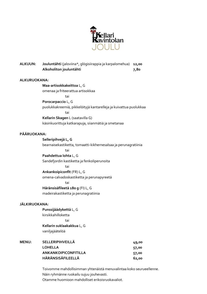 Joulujuhlat Kellariravintolassa ryhmille